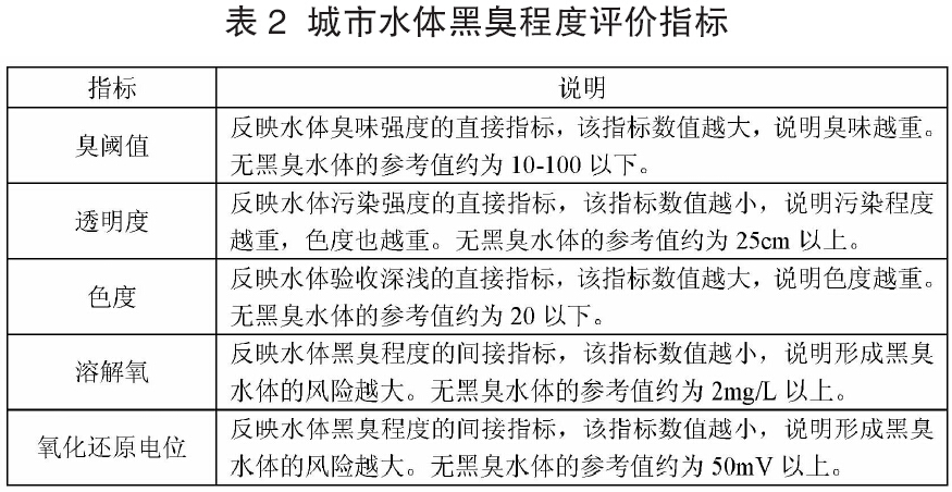 不同指標(biāo)對水體黑臭程度的指示作用及檢測方法如下表所示: